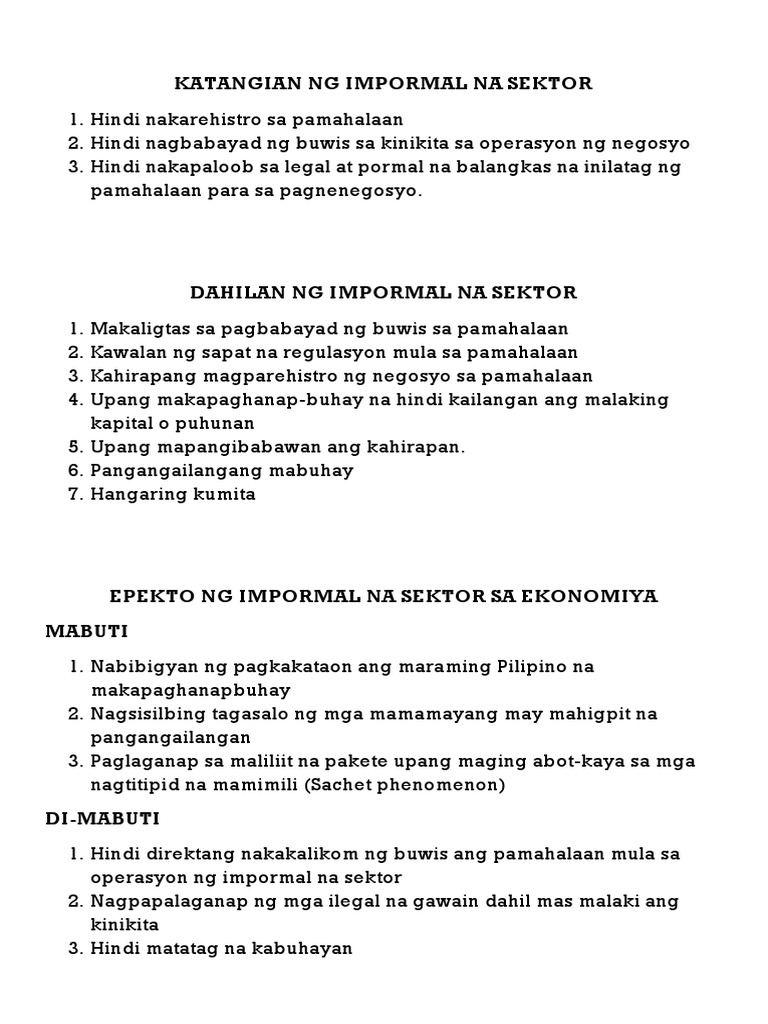 Ito ay ang sari-saring hanay ng mga gawaing pangkabuhayan kumpanya trabaho at manggagawa na hindi kinokontrol o pinoprotektahan ng estado. Balitao etal Makapaghanapbuhay ang hindi nangangailangan ng malaking kapital o puhunan Makakaiwas sa Bureaucratic Red Tape Mapangibabawan ang matinding kahiraan EPEKTO NG IMPORMAL NA. Napahahalagahan ang kontribusyon ng sektor lalo na sa panahong may suliraning pang-ekonomiya ang bansa.