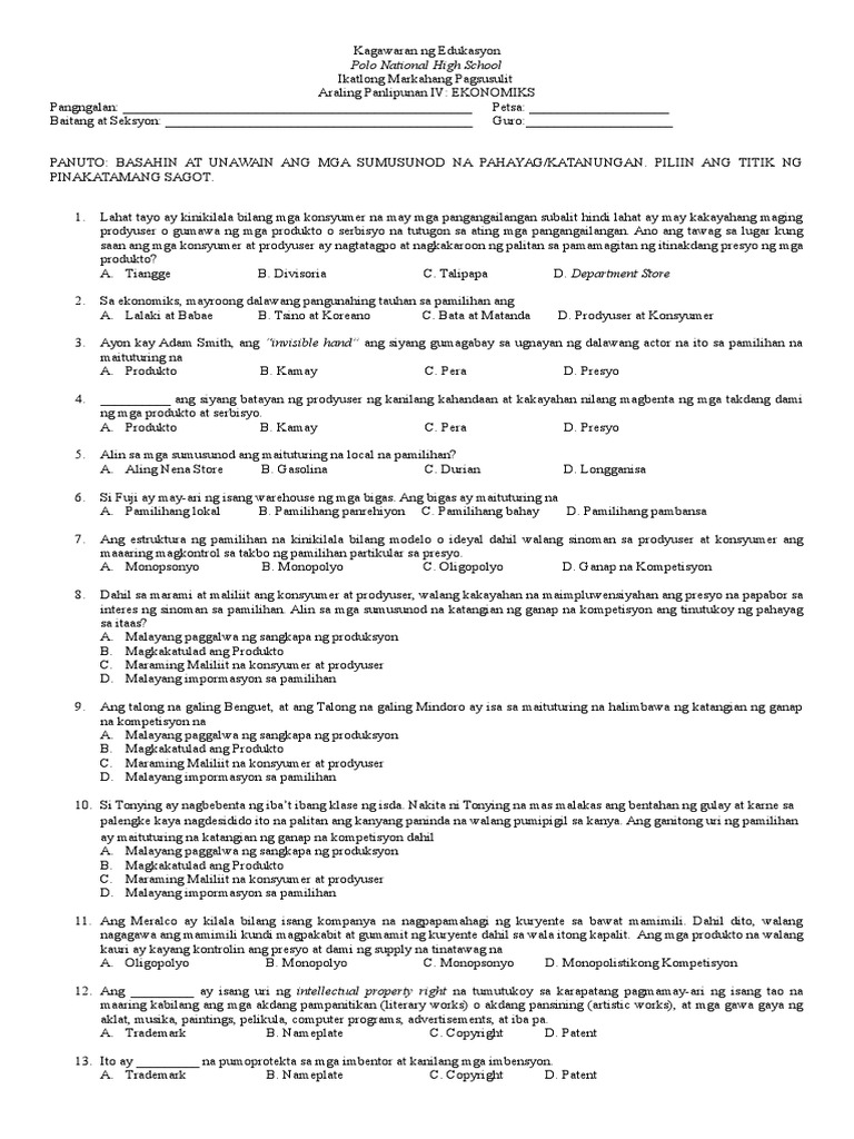 Araling panlipunan grade 9 ekonomiks exam 3rd quarter. Quarter 1 Ekonomiks. Basahing mabuti ang bawat aytem at bilugan ang titik ng tamang sagot. Grade 9 Araling Panlipunan Quarter 1 - 4.